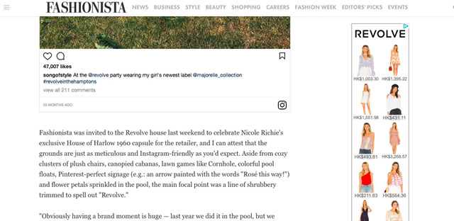 比如今年三月的沙漠主题campaign(party),大家就一起去了Utah REVOLVE的线下动作也很特别。他们在L.A的购物娱乐聚集地Melrose Avenue租下店铺,却不做生意,只邀请品牌VIP(比如大买家,博主们,电影明星等)来看新衣服,开party。REVOLVE把它称作Revolve Social Club。