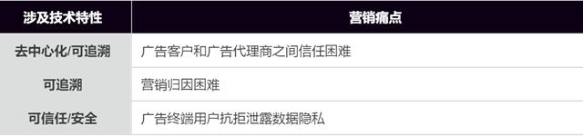 另一方面,逐利也带来了过度关注,而过度关注进一步引发了各种新闻事件的热炒和传播。作为一名营销人,有流量的地方,就我们的身影。那区块链技术在营销领域产生了哪些营销呢?我们又可以利用区块链去解决哪些痛点?在此,我们先来看下,什么是区块链? 区块链是分布式数据存储、点对点传输、共识机制、加密算法等计算机技术的新型应用模式。乍一看是不是很拗口。但简单理解便是,由于以上的那些看不懂的技术,使区块链具有去中心化、可追溯、可信任、安全的特性。那这些特性又有什么用?小编暂且将它归为以下几点: 1.“去中心”——深刻地改变了生产关系 在过去,生产者和购买者,可以会需要平台去连结。比如滴滴,将司机和用户连结起来;比如美团,将商家和用户连结起来。若利用区块链的“去中心”的话,那么就不需要滴滴了,没有了“中间商赚差价”,司机和乘客都可以获利更多。 2.“可追溯”——每一笔数据,都可以追溯到源头,它是怎么来的 可极大程度克服数据传输过程中丢失的问题,同时也便于跟踪管理。 3.“可信任”——中心化机构的基本职能之一 比如淘宝,买卖之家无法充分信任,所以付款时必须经过淘宝这个中介方去操作,如果区块链技术运用成功,那么买卖双方就不需要中介方去做信用搭桥了。另外,这一特性也意味着可匿名,即交易对手无须通过公开身份的方式让对方自己产生信任。 4.“安全”——避免数据篡改和伪造 如果数据要想篡改或伪造,必须经过超过51%的节点被控制住才行,否则单个节点的修改是无效的,这保证了可靠性和稳定性。 说完了这些特性,那么,对解决营销痛点有什么用呢?