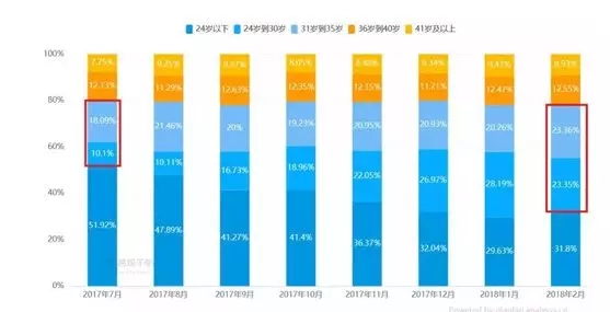 2017年7月-2018年2月抖音APP用户年龄属性
