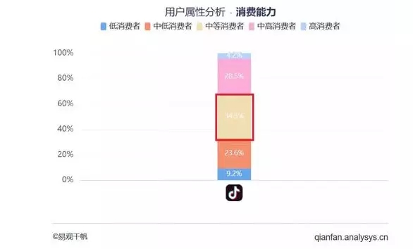 2018年2月抖音APP分时活跃情况 更让品牌们“眼馋”的是与年龄层一起上浮的用户消费能力。从去年7月到今年2月,收入、消费水平高的24岁-35岁人群占比从28.19%增至46.71%,超一线和一二线城市用户占比达63.87%。中等、中高消费者占比已达63%。