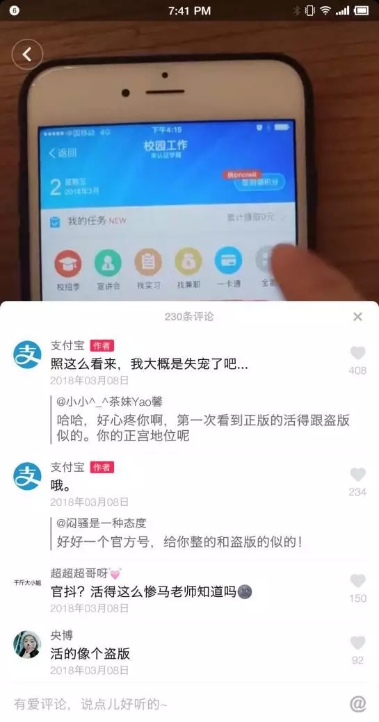 而从品牌热度榜来看,支付宝、淘宝、小米、AdidasNEO等网红brand持续领跑,英雄联盟、恋与制作人这些高热度品牌依旧吸粉,微博上的“80万蓝V总教头”海尔显然还在找感觉,爆款频出的网易line还在探索期,老司机杜蕾斯直接缺席,倒是一直中规中矩的联想突出重围,实力吸粉。 品牌营销蓝海的另一面是品牌增粉红利期。在月活用户以亿计的抖音,最不缺的就是观众。很多占据先发优势的品牌实力演绎着“一天吸粉上百万”,或“一天从小透明到大V”的吸粉神话。 各显神通 当然,也有品牌的粉丝数始终在100以内徘徊。即使身处红利期,要想成就一夜爆粉的“神话”,品牌们也必须凭真本事。 为俘获用户芳心,拿下“地盘”,品牌们拿出看家本领,各显神通。抖音中用户买账的五大门派。 门派一:逗比段子手派 代表品牌:支付宝、淘宝 招式:卖惨、编段子、调侃老板 继“最不正经官方公众号”后,戏精支付宝又祭出了个“最不正经官抖”。 你很难想象这是个品牌的“官抖”,相反,他更像你身边一个内心戏十足、贱不喽嗖,逗比又可爱的男同事的小号,让你全无距离感,忍不住想调侃(tiaoxi)两句。 初来乍到,没什么人关注,先自嘲“我大概是失宠了吧”,卖一波惨。被网友群嘲“最惨官抖”,“活的像个盗版”。