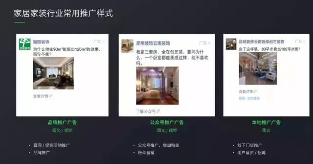下面我们就来看看微信朋友圈广告中家装家居行业怎么做? 分析 广告应该如何展现?在优化师的视角里,保持中立,在目标用户和广告主之间达成共识,在交叉的诉求中找到共同的利益点,才能出精品。 创作 1、最佳形式:朋友圈广告