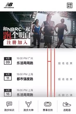 同时,New Balance还推出了一款专业的跑步小程序,里面包含线上活动预约、跑步专业知识、赛事支持、专业选鞋器等各种专业性内容。还有专门针对初中阶跑者和中高阶跑者的线下活动,把热爱跑步的人们聚集在一起。