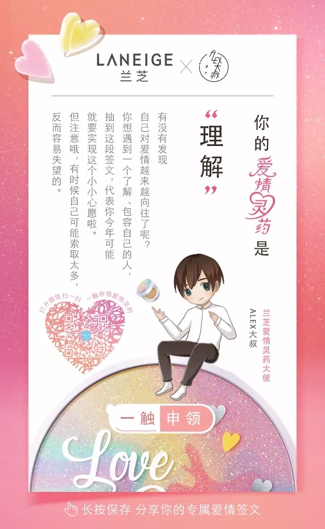 会玩的兰芝在近两年一跃成为化妆品品牌营销界的黑马,不断在朋友圈和现实中生活中频繁刷屏。 这个专为全球年轻女性打造的时尚化妆品牌,自创立以来,就对肌肤保湿效果潜心研究,来帮助时尚自信的年轻女性随时随地拥有自然水润的肌肤,短短几年,就精准抓取年轻女性的消费群体心理,不断用花样营销攻占年轻消费者。 玩法一 携手Alex是大叔、李圣经, 3月恋爱季用爱情灵药攻占你的肌肤