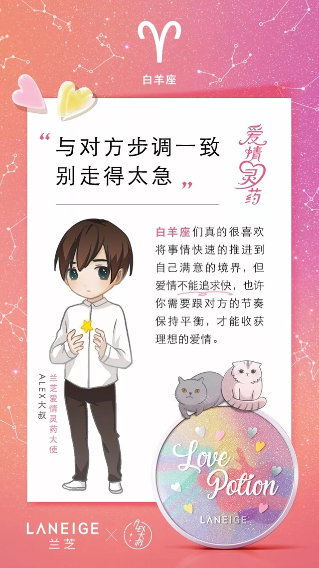 知名占星师@Alex是大叔 从品牌创立之初,年轻时尚的气质就是兰芝吸引用户的关键。在产品创意上,兰芝找了李圣经代言,并携手知名占星师@Alex是大叔在推广期作为兰芝爱情灵药大使。在3月恋爱季中发起爱情、情人节、恋爱妆容等美妆话题。 针对整个产品主题爱情灵药的推广,把爱情魔法恋爱季作为新品小白光气垫BB霜爱情灵药限量版的主推元素,让整个营销主题更现代、时尚,更具辨识度。
