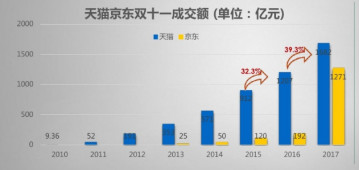 2、坚守阵地:销售额不断冲高 从2009年11月11日,淘宝商城(现更名为“天猫”)举办的一系列促销活动,以有限的力度,换来营业额大步提升,远超预期。2013-2014这一年,各大品牌跃跃欲试,开始尝试制造属于自己的节日,而2016-2017这一年“品牌造节”已经成为品牌营销的常态化。 或许有人就会心生疑问:“在品牌造节慢慢进入成熟阶段,这一营销方式还有效果吗?”以双十一为例,天猫销量持续攀升,2017年再创新高,冲破1682亿!较去年增长39%。另一电商巨头京东的表现同样火爆,创造出历史最高交易额1271亿元。