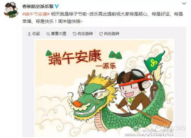 但是,并不是每个品牌的造节都会像淘宝“双十一”那样成功。在中国,每年有大大小小几十个传统节日,抓住“节”点,品牌营销一样会成功! 结合传统节日的品牌营销 1、春秋航空+端午节 春秋航空派乐猴,不走寻常路,放弃了花俏的创意方案,直接送出一份温暖的祝福,在微博上打出“粽是顺心、粽是好运、粽是幸福、粽是快乐!端午安康。”的广告语。