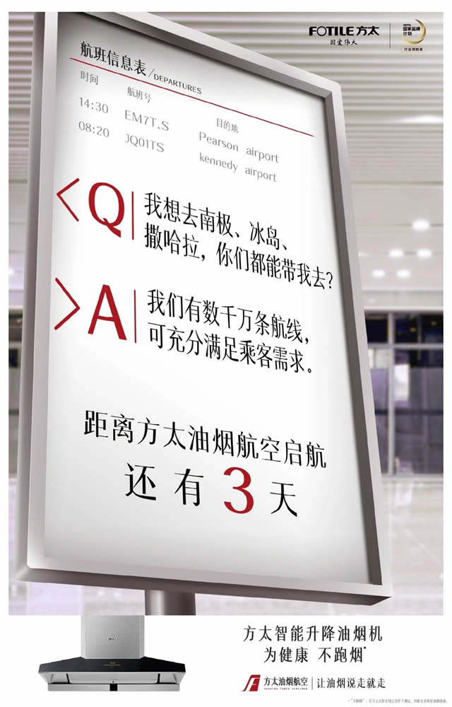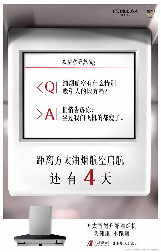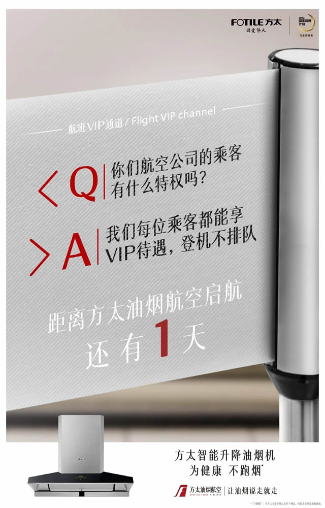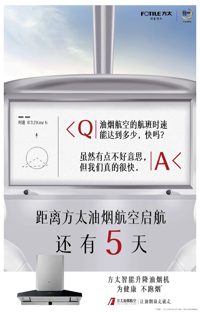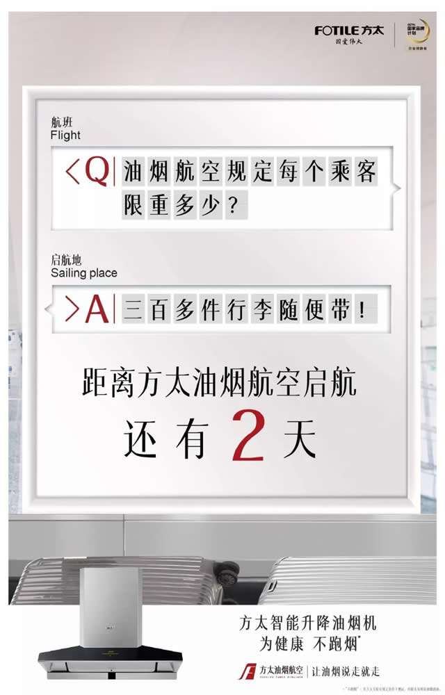 还有,请注意看“方太油营销战略烟航空”前面的那个标识,是精心设计过的。可以说乍一看,很有航空公司的韵味了。 另外,在前期“方太油烟航空”预热的时候,倒计时海报的视觉元素和文案,也没有脱离人们对航空公司系统指示符号的既有印象。