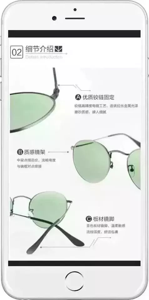 图二 手机形状小而长,日常浏览信息时,我们也会倾向于由上往下。所以,我们要尽量上下分栏,而避免左右分栏。 3、足够聚焦 当我们的眼前是一张白纸,我们的目光会聚焦在整张纸上;若纸上有一个小圆点,我们的目光就会被聚焦。 而自带小属性的手机,也意味着用户的目光会足够聚焦。 所以,在设计时,我们要能保证用户可以最大限度记住页面上的内容。 设计优化方案: 1.一屏一主题 一屏于手机而言就是最小的信息单元,即用户可以最大限度看到的信息内容。 而一屏一主题,一方面可以内容一目了然,用户只需浏览一遍便可记住,另一方面减少了信息与信息间的互相干扰。 a.比如图一:卖点较多,阅读后印象并不深刻 b.比如图二:整屏突出一个卖点,更有冲击性,且阅读后印象更为深刻