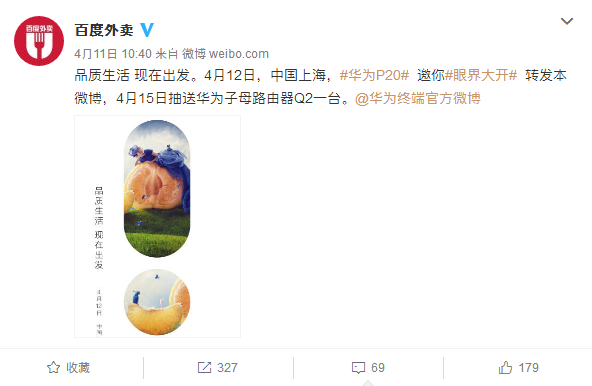 “品质生活 现在出发。4月12日,中国上海,#华为P20# 邀你#眼界大开# 转发本微博,4月15日抽送华为子母路由器Q2一台。@华为终端官方微博 ????” 文案主要告诉粉丝,转发即可赢得华为字母路由器Q2,这个诱惑还是比较大的。并且它在文案当中添加了话题#华为P20#,这是华为新品上市,定能吸引更多的粉丝互动。