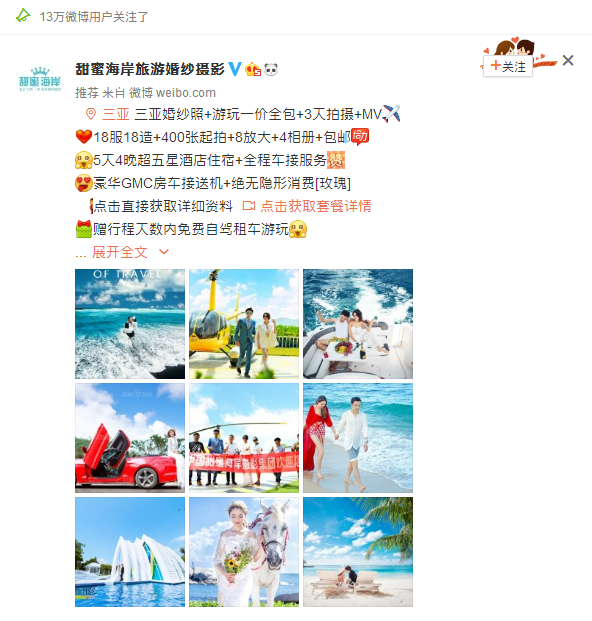 关于婚纱摄影,用户比较关注的还有“套餐详情”,也就是广告主打的内容,这些都是非常具有吸引力的点。 4、免费也是卖点