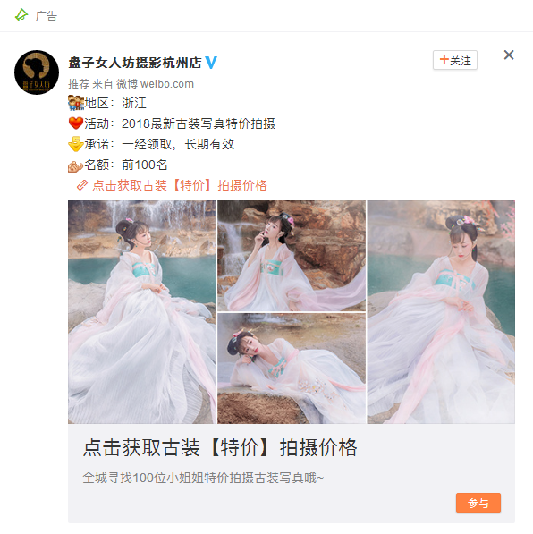 价格是用户最关心的一个点,例如这组婚纱摄影的广告,设置了价格详情页链接,用户真正有兴趣了解就会点击这个“特价”链接,这样获取的目标用户更进准,广告的点击率也就上去了。