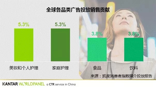 中国市场会是怎样的呢?凯度消费者指数Consumer Mix Modeling(CMM)研究发现, 从2016-2017两年,快速消费品广告投放所带来的销售贡献占比平均为4.0%,低于全球平均水平,而2017年只有3.8%。 02:广告投放的销售贡献高低与类别有关 不同品类的广告投放对销售额的贡献力度也有所不同。