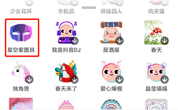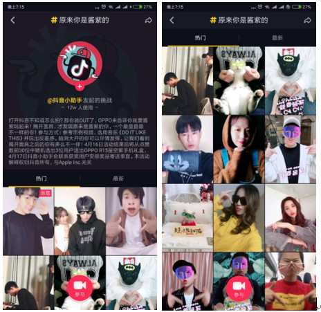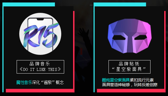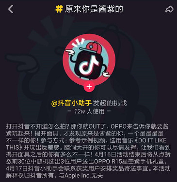 另外两位达人也毫不示弱,均做出了播放量80万+的作品。除了置顶的11位达人之外,武林中也有高手自发加入挑战赛,包括粉丝945.2万的@张欣尧 以及粉丝155.4万的达人@刘淼麟-Notus 等。达人的加入和示范效应推动了粉丝模仿及二次传播,最终形成了病毒式传播。 据平台统计,此次挑战赛,OPPO指定的合作达人贡献的播放量达到419万,加上自发来参与的达人,挑战赛的视频成功覆盖海量抖音用户,获得高曝光自然不在话下。 秘籍二:定制贴纸+版权音乐,视觉+听觉立体传播 OPPO和抖音联合定制了“星空紫面具”贴纸,用户可以选择此贴纸来进行抖音视频创作。这个贴纸的颜色来源于OPPO 旗舰新机R15的全新配色星空紫。