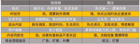 (短视频行业TOP5播放量占比将近七成,头部效应明显 ) 头部玩家已设定好玩法,由于用户规模较大,粉丝认可度较高的一些头部IP,内容质量略有下降甚至断更,热度仍然不减。腰部的内容创作者就没有这么任性的资本,面对僧多粥少的局面还是要含泪陪跑,不仅要对内容精耕细作保持迭代,还要对行业变动冷暖自知。垂直短视频想要突围并非易事。如果在上半场厮杀中错失了先机,后半场较量还需认清形势从长计议。 Par2、短视频也“挑食”?不是所有内容都适合短视频化 排除运营不良等人为因素,也有针对短视频形式发出的质疑:“短视频热”是不是资源要素向风口的非理性聚集?是否所有的内容都适合短视频的传播形式? 1.图文 VS 短视频 目前短视频分流图文用户的趋势非常明显。公众号打开率持续低迷,短视频用户却持续增长,内容创作者不断涌入短视频行业争先成为“站在风口的猪”,资本也紧跟着短视频的脚步,图文内容在即将到来的5G时代面前瑟瑟发抖。