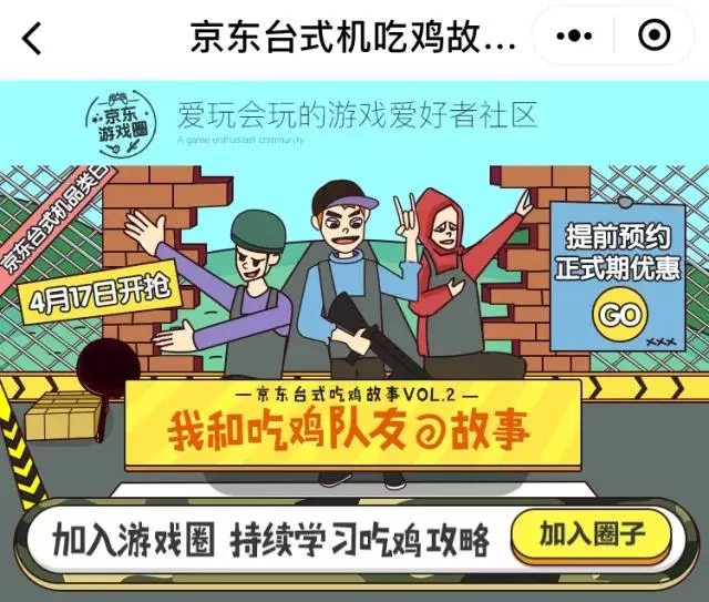 4月17日,京东台式机品类日震撼来袭,在线上引入游戏IP,而线下更通过京东微信购物游戏圈等渠道向资深玩家们发出召集令掀起了游戏咖们的对面狂欢。线上线下齐发力,京东台式机品类日在广大游戏爱好者中俨然成功圈粉无数。 畅爽沙场购物体验,京东台式机用神器助玩家吃鸡 为了让热爱吃鸡的击友们能够有更加畅爽的体验,京东台式机品类日与腾讯天美《绝地求生 全军出击》进行深度合作,带来了4月17号的吃鸡主题专场。