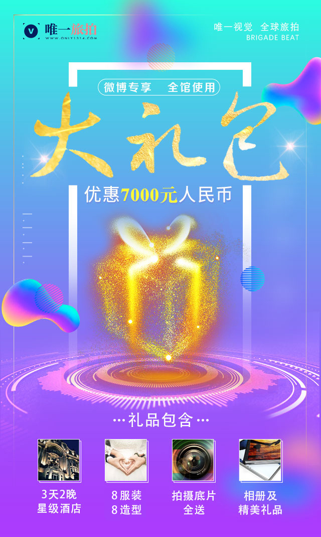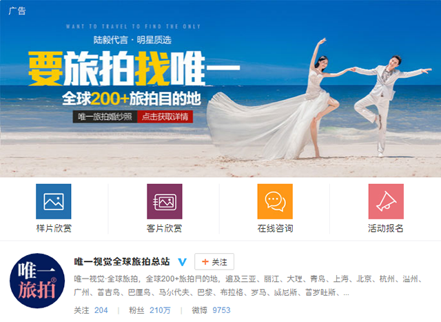 刷微博的朋友都知道,微博信息多以图文和视频为主,而对于广告主来说,微博广告正式以原生信息流的方式展现。那么我们的信息流广告需要一些比较精美的图片或者创意视频来吸引更多的粉丝。今天且不说视频,这里给大家讲一讲婚纱摄影投放微博广告的配图技巧,想要在粉丝通上进行广告投放的广告主们赶紧get起来吧! 微博信息流广告投放需要的配图一般分为两种,一种是外层展示图片,另一种是广告落地页的图片。这两处图片需要做到创意清晰、吸引注意、刺激购买欲望。具体应该怎么做呢? 1、外层图片 外层图片是给用户的第一印象,就好像相亲一样,一开始大家互相都不了解,所以要从最直观的一面来判断ta是不是我想要的,那么外表就非常重要了。因此外层图片设计一定要美观。 基于微博广告的展现形态,一种为信息流首页通栏大图,另外一种就是比较常用的九宫图。 信息流首页通栏大图的设计可以选用婚纱摄影的样片图作为背景,如下:
