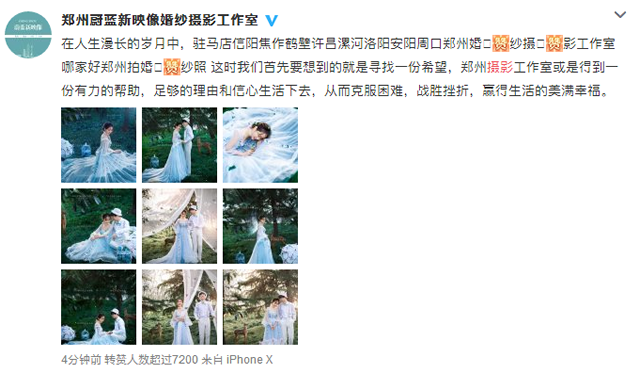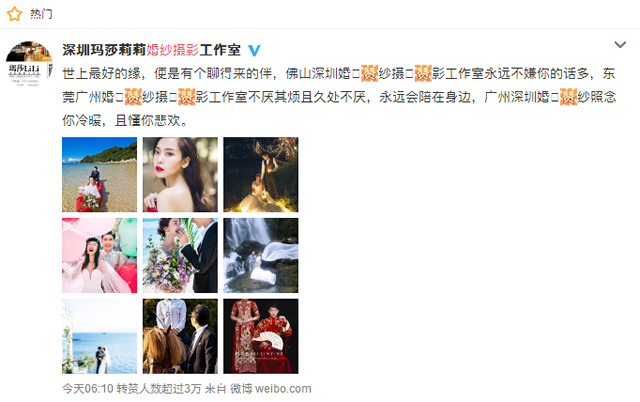 九宫图微博信息流广告就没有这么复杂,其图片以婚纱摄影的样片或客片为主,可以发布不同风格的九张图片或者主推的主题套餐风格图片。图片的选择与广告主的审美相关,同时也要考虑用户的需求,例如用户需要个性化的、小清新的、韩风的、欧美风的还是街拍等等。