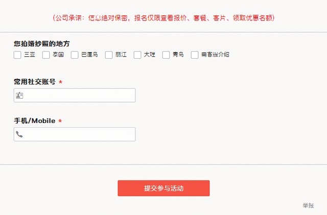 一般落地页不再以婚纱摄影的样片为主,而是以您要推广的信息为主。例如优惠大礼包、摄影套系内容等等。总之要突出你活动的亮点和不同之处,能够更好的吸引用户。 一般落地页上都会有要求客户留下联系方式等内容。这里就不要很繁琐的设计了,有些广告主希望客户一下子把信息给全了,设计姓名、电话、QQ、微信、地址、身份证号等等一连串的信息让顾客填写,这些都是不可取的。因为涉及到更多隐私的信息会引起客户反感,而且需要信息内容过多会引起客户警觉,信任感降低。 如下设计就是非常合理的。