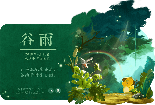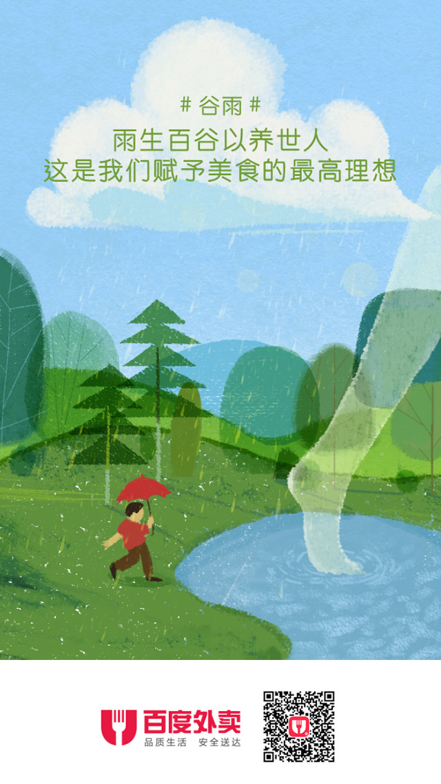 当用户通过浏览器搜索“谷雨时”会弹出这个谷雨节气广告浮层,清新的画面设计给人身临其境之感。 百度外卖 “雨生百谷以养世人,这是我们赋予美食最高的理想”