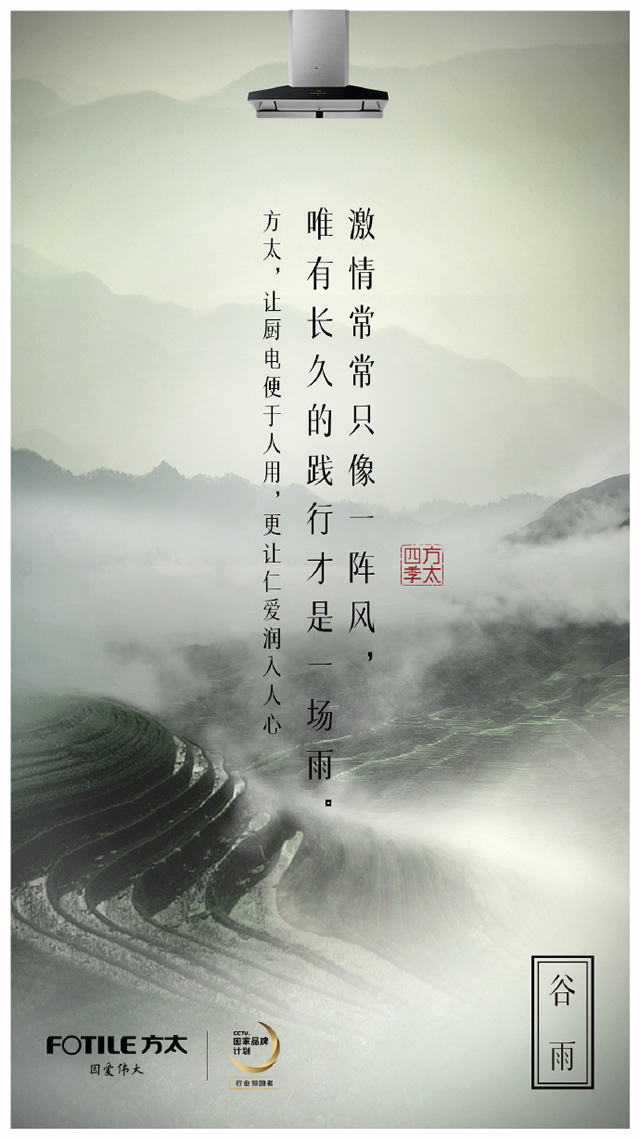 踏雨前行,正是春游好时光。比亚迪谷雨出行更浪漫。 方太 “激情常常只像一阵风,唯有长久的践行才是一场雨。方太,让厨电便于人用,更让仁爱润入人心”