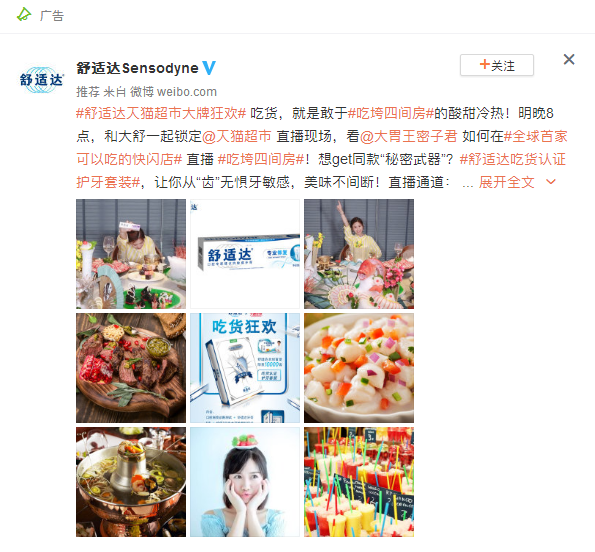 通过舒适达的宣传海报我们可以看到,其营销点在于“吃货”,这正符合当下年轻人的美食攻略。通过这些营销痛点,找到符合自己的品牌定位,让粉丝跟品牌之间形成互动,更好的推动品牌营销。