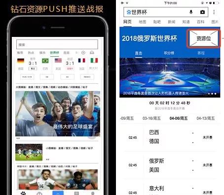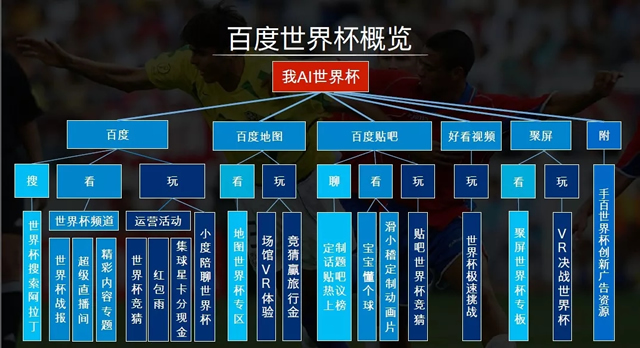 百度2018世界杯资源:搜+看+玩三大版块,握紧热点流量入口 百度2018世界杯资源 2018全球最火爆的热点事件! 百度整合旗下资源,以领先的人工智能作为支撑带给用户全新的感官体验、需求满足、新鲜热辣资讯内容,2018世界杯,百度带用户一起AI起来! 世界杯资源优势 将在百度搜索“世界杯”词、百度APP世界杯频道,百度信息流世界杯专题新闻顶端,世界杯阿拉丁,世界杯新闻推送,世界杯直播间、竞猜和红包雨、百度地图、百度贴吧-世界杯和足球相关吧,直播节目等多种形式植入您的LOGO,借助世界杯热潮,引爆品牌认知!秒懂百科-让您的LOGO和足球巨星同时播放!