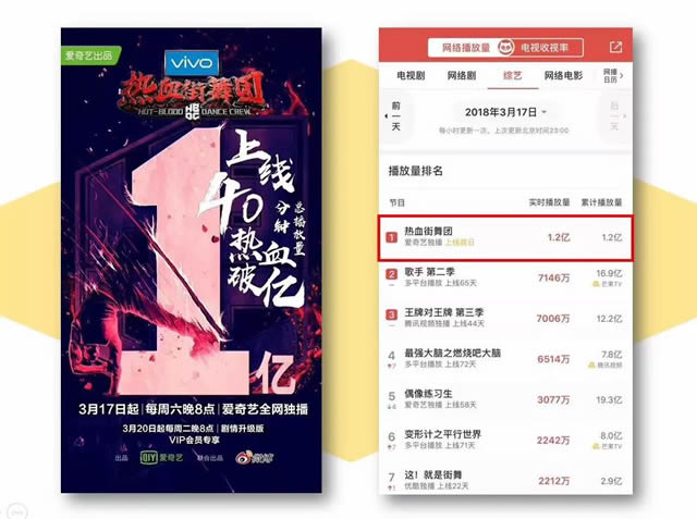 作为爱奇艺打造青年文化系列节目之一的《热血街舞团》,在招商初始就获得了众多金主爸爸的青睐,他们深知好IP就要毫不犹豫买定离手的规律,在招商初期所有身份就已一抢而空,而《热血街舞团》也在上线之期没有辜负广告主的厚望,40分钟流量破亿,占领全网综艺当日播放量榜首。 a 《热血街舞团》上线数据 至发稿当日,《热血街舞团》播放量已达10亿,碾压同类街舞节目。