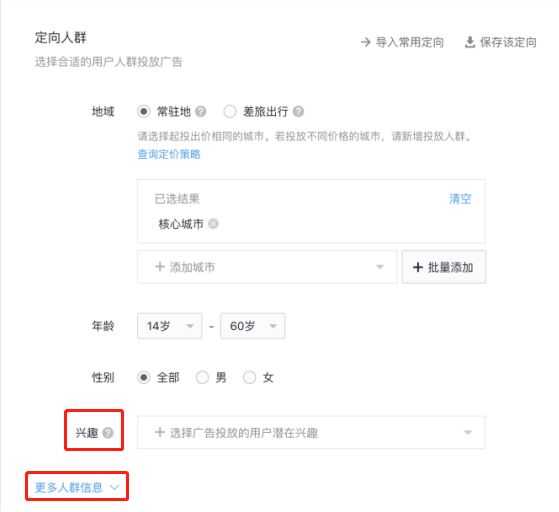 二、推广功能优势 知道怎么玩了,肯定要看看本次推广功能里有什么优势,能带给商家什么益处。 1、定向人群细分,目标用户一击即中 投广告最怕就是“投”不到目标人群,花大钱没达到理想转化。在创建小程序广告时,提供了一共14个人群细分领域,除了基础的地域、年龄、性别基础信息选择外,还提供了兴趣、学历、婚恋状态、手机系统等领域选择。 最最最重要的是“兴趣”一项,提供24个一级兴趣标签,183个二级标签供选择,并且官方会根据近三个月用户的社交轨迹(如公众号订阅类型)和行为表现(如文章阅读类型)帮你选择潜在用户。在小程序上投放广告更精准、更有效、效果更好。