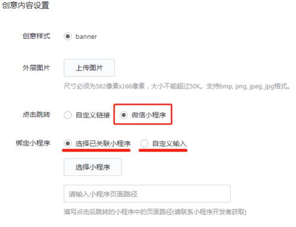 2、由流量主决定实际播放位置 这就像是我们平时浏览网页、微博,指不定在哪就能看到广告。以后除了小程序顶部的轮播图,再结合现在的小程序广告(广告大小有规定哦,后文会解释),多种广告形式结合起来,小程序与网页完全没什么两样,除了不能做浮层。 3、支持两种推广类型、可跳转外链 目前小程序推广功能支持两个推广类型: 1)品牌活动推广; 2)电商推广; 在设定推广类型后,小程序页面广告右下角将显示对应的推广类型。并且,目前广告位展示仅支持“图片”形式,点击“图片”后可跳转至:小程序(指定路径)和H5外链(自定义)。