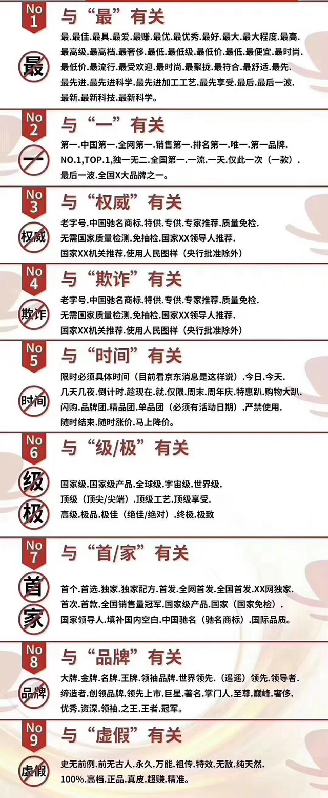随着 3·15 晚会的产品大量曝光,各大互联网平台也在期间做出了一些动作,竞价和信息流的广告投放平台政策持续收紧,很多广告主的投放素材以及流量受到限制,尤其是一些敏感行业(你懂的……)。我们先来看这张流传甚广的广告违禁词总结图,据说搞电商的,90%都中过招……