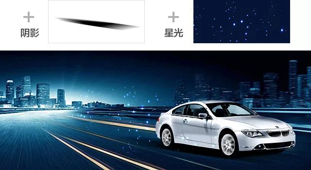 STEP 2 主体产品 我们发现汽车的阴影略显生硬,所以为它增加了前后延伸的阴影,表现出车辆飞驰的速度。另外星光也是很适合在夜景中使用的元素,为汽车增加了灵动和精致感。