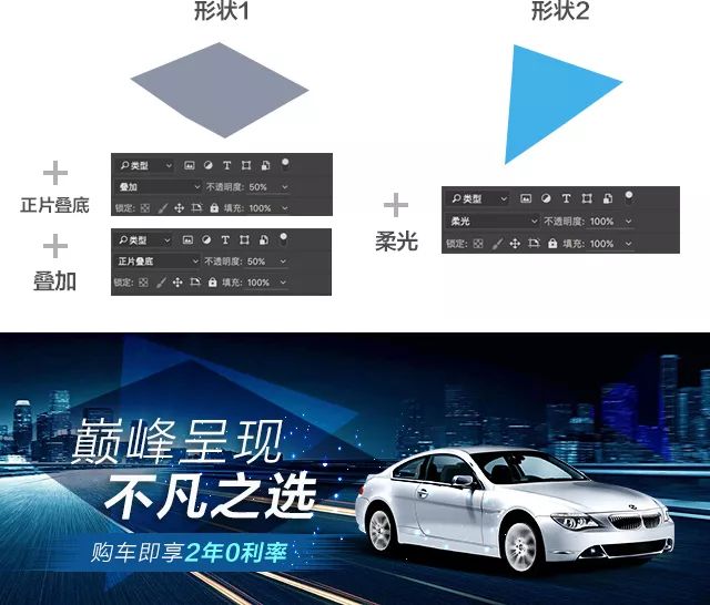 STEP 4 细节微调 在主标题下方,我们增加了形状1,复制了两层,分别用叠加和正片叠底的模式,覆盖在背景上,这样又可以保留背景的细节,又加深了背景的颜色,起到了突出文字的作用。形状2是一个亮蓝色的三角形,用了叠加模式,提亮了背景,增加了文字和背景之间的层次感。