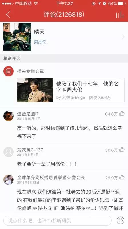 (周杰伦《晴天》在网易云音乐上获超212万评论) 围绕音乐社区,网易云音乐推出的乐评、歌单、动态、视频这些功能,吸引了许多有观点、爱表达的高质量用户。根据Questmobile报告显示,网易云音乐的用户集中在一、二线城市,90后、00后用户居多,其中90后更是占据近半壁江山。