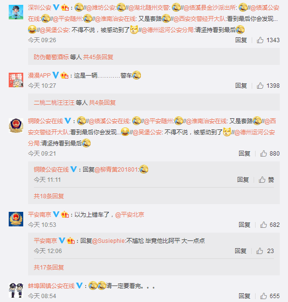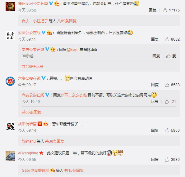 此文由大V号“静姐姐的静”(微博认证前 中国警察网安徽站官方微博管理员)发出,仅仅几个小时转发和评论数就超过5万,同时也引得各同僚的各种调侃和支持。