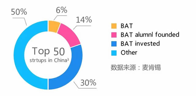 BAT在诸多领域的投资竞赛愈演愈烈,频繁投资的驱动力在于生态系统布局。 与传统企业相比,互联网公司在成本共摊和市场共享方面的优势更突出,凭借技术优势可以将巨大的流量红利从一个领域迅速复制到另一个领域,依托生态系统迅速扩张形成“黑洞效应”。 据麦肯锡统计,中国排名前50的创业公司中有50%要么是BAT,要么属于BAT系。此外,互联网公司也非常注重长板运营。BAT凭借各自的原生优势(阿里的电商流量,腾讯的社交流量,百度的搜索流量),为精准营销提供强大的数据和技术支持,吸引品牌主将营销预算越来越多地转移到BAT广告平台,品牌方也越来越倾向于在内部设置媒体购买(Media Buy)的角色。互联网公司正在成长为营销产业链条中强势的一环。