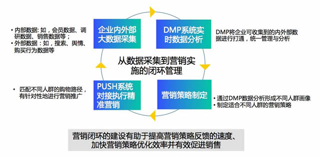4、广告主要求数据回流并自建DMP 随着企业的互联网数字化程度不断提高,品牌主可获取的内外部数据源日益丰富,数据体量日渐庞大,为了更好地发挥数据价值,品牌主势必寻求外部数据回流,内外数据打通,来管理和运营品牌的核心数据,从而指导未来的营销策略制和执行。这其实也是品牌主进行营销闭环建设的需求,从数据的采集、整合、分析到形成洞察,以大数据的思维和方式来指导品牌营销、产品定位、渠道选择、甚至是定价与促销。 品牌主自建DMP,数据整合是基础,数据分析和洞察是核心,精准推送是目标,对于品牌来说不论是请外部专业团队帮互助还是自己组建团队,自建DMP都是已经提上日程的一项需求。