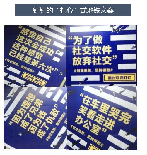 2、品牌以“扎心”式的营销方式获取影响力 今年网易云音乐和钉钉不约而同地把营销阵地瞄准地铁。网易云音乐将APP内点赞数最高的5000条原创乐评贴满了杭州地铁,这些用户原创乐评本就是网易云音乐社区最著名的特色之一,每一句乐评背后都有一个故事,这些故事总能戳中其他用户的泪点,这就为用户提供表达情绪的通道,收获了不俗的营销效果。 钉钉则是聚焦创业群体,以同是创业者的立场出发,以“扎心窝”式的文案展现了创业路上的苦与痛,为同处于艰难中的创业者打气,直击创业者的内心深处,同样收获诸多好评。