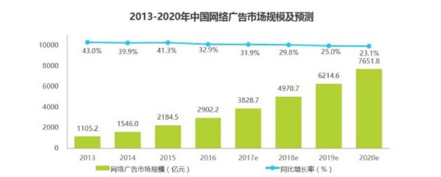 据《2018年中国网络直播营销市场研究报告》数据表明,2017年中国网络广告规模预计近4000亿元,在中国广告市场中占比将超过50%。受网民人数增长,数字媒体使用时长增长、网络视听业务快速增长等因素推动,未来几年,报纸、杂志、电视广告将继续下滑,而网络广告市场还将保持较快速度增长。