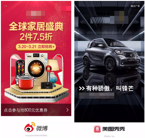 优势: 1、尺寸大,更利于抓人眼球; 2、目光较为集中,点击率相对Banner高; 痛点: 容易造成误点,浪费广告预算; 投放建议: 1.广告尺寸最好等于或大于手机屏幕的一半,可设计600*600、600*500等尺寸; 2.注意与应用的协调性; 推荐平台:一般游戏类、视频类APP是插屏广告最常用的媒介类型。 开屏广告 开屏广告出现在APP启动时,一般会全屏展示3-5秒(也可选择跳过)。通常展现形式为:图片、短视频或Flash等。