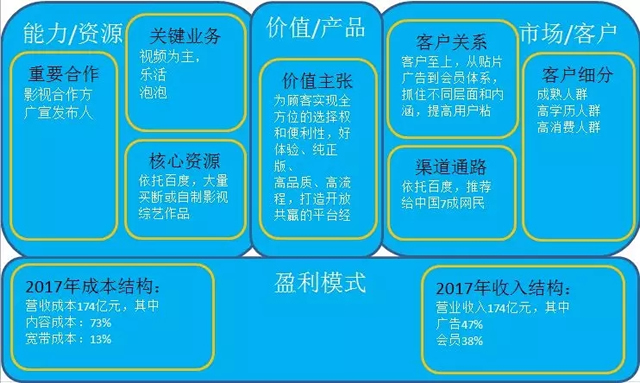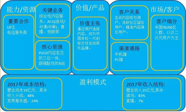 聚焦中学、大学生,采用PUGC模式构筑一个干净、纯粹的二次元生态圈 两公司发挥资金、市场优势服务价值客户 任何一种商业模式,核心要素不外三项:客户、价值、利润,以合理的价格向目标客户提供了有价值的产品或服务。 1、聚焦客户与价值诉求的差异 当年,优酷网击垮传统电视台,那是优酷比电视台更好的满足了网民文娱需求。爱奇艺超越老牌品牌优酷土豆,主要是爱奇艺抓住了高净值用户对影视高品质诉求:内容上,大量采购正版、高清的影视资源,杜绝盗版、非高清视频;在技术上,重视客户体验,开启了以技术创新为推动力的“智服务”时代;在客户资源上,依托百度强大的广告客户资源,打造SWS模式(搜索-观看-分享)聚焦核心竞争力,为品牌广告主提供高品质、高性价比的广告服务。 爱奇艺一路高举高打,累计烧钱近500亿元,年营业收入也随之高歌猛进,逼近200亿元大关,成为中国第一高清正版影视门户网站,多项核心数据均居全行业第一,颇有大家闺秀的风范。