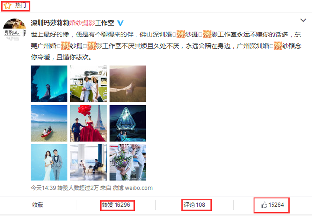 2、产品要够“靓” 婚纱摄影的用户以年轻人为主。现在年轻人追求个性,如果你的图片放一些老掉牙的拍摄样片,可是不能吸引人的。同时你的样片也需要精致,有些摄影的PS技术不行,人家一眼就看出破绽,那就丢人丢大了。 3、活动要够“热” 一般在微博粉丝通上头广告的婚纱摄影机构都是有优惠活动的,例如“仅限99对新人”、“领取优惠券”等等。这些优惠活动会带动刚需人群而促进成交。活动够不够“热”,就要看你的文案做的好不好了。 4、好文案更吸粉