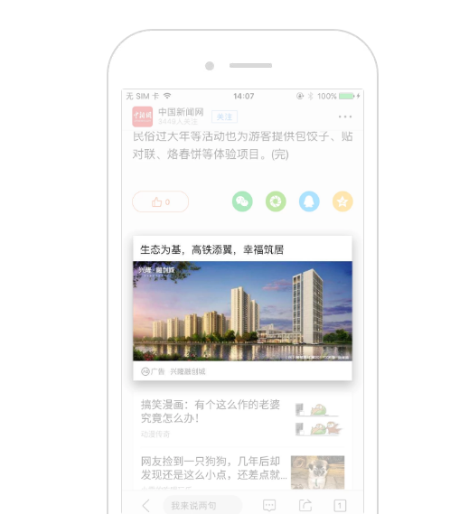 2、原生信息流广告,用户体验超爽 QQ浏览器广告将沉浸式的原生广告呈现在用户面前,其中广告分为大图、单图、多图、视频、本地等多种展现形式,给用户更畅快的阅读体验,不会对广告产生反感。