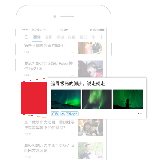 腾讯新闻通栏大图广告形式 3、广告文案设计 产品促销活动的文案设计不需要太复杂,一般直截了当的阐述活动内容,例如“某某商品5折优惠”、“某某商品仅售XX元”。这个文案得根据产品的促销力度来定,简单粗暴,也很容易引起别人的关注。 4、图片设计 广告的图片设计尽量选用鲜艳的色彩,一般以“中国红”为主,不过也得根据促销的时间和特定的节假日来选择,这个就需要与设计师沟通了。 5、广告成本预算 腾讯新闻广告有多种计费方式,企业根据要选择的广告投放位置和广告投放的效果来进行成本预算。 腾讯新闻用户月活跃度超过2.4亿,且且用户具备深度浏览习惯。腾讯新闻广告正是以原生方式出现在资讯信息流中,根据用户属性、历史浏览行为和兴趣爱好进行精准定向投放。企业的广告通过精准定向投放给受众人群,大大增加了广告的曝光率和转化率,给企业带来的效果也是非常可观的。如果您有意在腾讯新闻投放广告,更多详细内容可以跟我们联系,我们将真诚为您服务!
