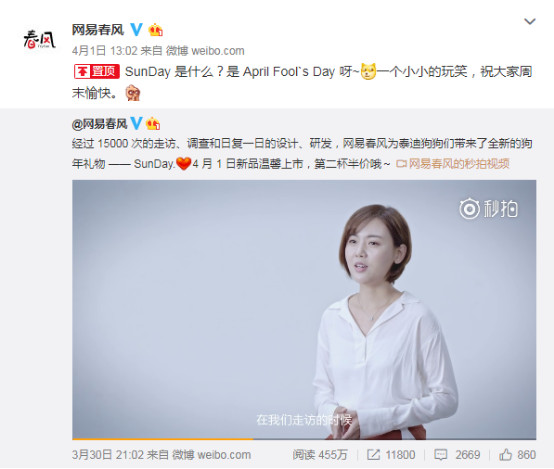 而到了愚人节当天,网易春风官微发了微博——告诉大家Sunday就是April Fool's Day,让人啼笑皆非。