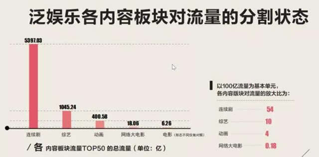 在IP及内容产业获得高速发展之后,传媒环境中的诸多改变均一一投射在了广告业中。 近年资本的大量进入,启动了内容产业中各内容板块产能的急速、被动扩充,内容体量及内容平台的竞速发展,也进一步推动了来自内容及内容平台的流量分流。面对流量碎化的压力,来自IP内容的流量聚合作用格外受到重视。 2017年,广告活动与动漫、游戏、影视等IP内容的合作数量激增,广告内容IP化走向的路径也日趋鲜明。 对于广告活动来说,IP化的广告效果仍处于市场验证中 《2017 IP年度发展全景报告》显示出泛娱乐各板块内容整体对流量的分割状态,其中综艺是动画的2.5倍,连续剧是综艺的5.4倍,网络大电影的流量分割能力则相对更弱。
