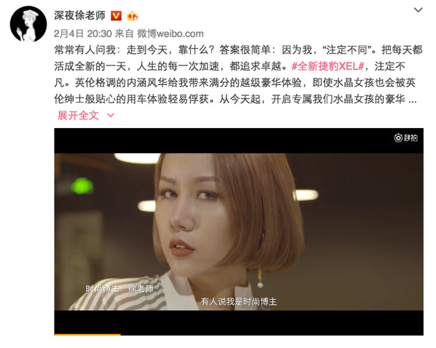 除了时尚品牌,徐老师团队也会给捷豹等汽车品牌定制视频广告 作为自媒体,徐老师并不算异军突起的新秀,在公众号平台,她一手创办的深夜发媸4年产出1500篇10w+,坐拥250w粉丝。 这个以时尚穿搭、美妆为核心内容的自媒体,不仅吸引了一大批年轻女性的关注,还帮助徐老师在2017年登上了奇葩大会,直接和高晓松蔡康永互怼。实际上,徐老师并不算真正意义上的老师,她本名徐妍,外界对她的标签是,时尚博主、行业意见领袖、创作者、90后CEO,然而她还是最愿意叫自己徐老师。