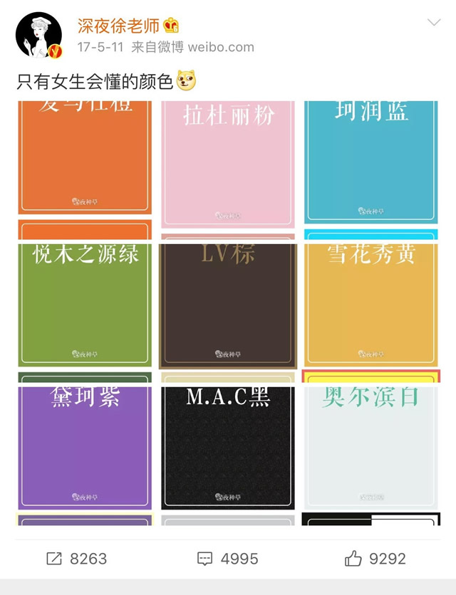 在内容的运营和规划上,徐老师花了很多时间研究微博的规则和用户喜好。他们发现图片、视频、测评这类冲击力强、信息量大、门槛低的“懒人” 内容,更容易引起用户的注意,而徐老师本人偶尔会发的幽默段子,也很能引起用户的共鸣和讨论。 根据这一特征,他们生产了很多内容,比如他们曾经发过一篇微博叫“只有女生懂的颜色”,最后获得了近700万的阅读,近万的转发。