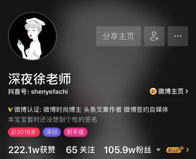 |“蹭热点、低门槛、形式新”,徐老师曾用这9个字概括自己的爆文心得。 目前,深夜发媸并不只是一个百万粉丝的大号,徐老师还构建了自己的新媒体矩阵,一口气做了4个垂直账号,总覆盖超500万粉丝。除了微信,徐老师开始像其他内容平台伸出触角,内容形式上也开始重点布局短视频。相对于4年前,徐老师已经从单打独斗的自媒体人,正式变成了一个创业者,她对深夜发媸的野心,也从一个大号,变成女性生活方式品牌。 进军微博和抖音,创意视频带来上亿流量 为了进一步扩大公司影响力,徐老师开始组建自己的新媒体矩阵,在2017年夏天,徐老师正式开始运营她的个人微博:深夜徐老师。关于这两年有些人唱衰微博的言论,徐老师的回应是,“这要看是谁在唱衰微博。”据她了解,微博仍然有很好的流量聚合变现的生态,只要能做出独特性和稀缺性,想在短时间成为大号并不难。 在这种情况下,徐老师做微博,更看重人设的独特性,以及内容和平台的匹配度。在人设的独特性上,徐老师团队在前期将徐老师本人的标签进行了系统的梳理,90后CEO、网红博主、爱买买买、语言风格接地气、有个戏精男朋友、家里一堆猫猫狗狗、满世界旅游、头发颜色一天一变……这些元素综合起来,就是徐老师的人设。 “我们当时拿着这个人设,在网上做过很多比较,几乎没有发现类似的,所以我们要做的只是把这些内容放大。”