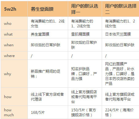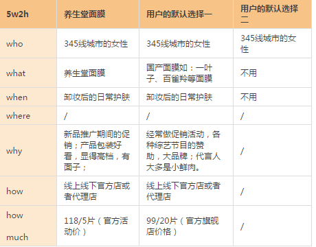 机会洞察总结:可口可乐的美妆,从产品的角度出发,多了许多其他社交性功能;尤其是当产品难以购买,遭遇疯抢,成为网红的时候,社交性能会更加强大。 可以看出,可口可乐×the face shop这款产品与其他普通的产品不同的 地方是:这不仅是一款普通的化妆品,更是一个具有强社交属性的产品,它可以在礼品赠送、收藏、社交等多场景下销售。 产品通过限量发售或分区域上市的噱头,打造一种疯抢而难求的稀缺感,使他不同于其他奢侈品的社交属性,他满足的不是消费者的高端需求,而是稀缺的可达性需,这是所有跨界合作的限量版产品所共同的特点。 养生堂面膜的产品洞察: 用户想要完成的消费任务:有补水需求、要做日常护肤的女性 你的主要用户:有消费能力的女性、主要集中在一二线城市的女性